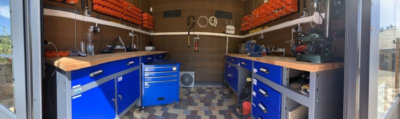 Endlich genug (naja ... genug isses nie) Platz fuer Elektrik-Krempel, Klempnerei und all den Werkstatt- und Werkzeugkram, der sich ueber all die Jahre so ansammelt. Das Elektroschweissgeraet ist immer griffbereit, ohne es rumzuschleppen. Der Schleifblock ist immer da, wo er sein muss, und die Staenderbohrmaschine ist nie im Weg und kein Auto muss aus der Garage, um die Werkbank zu nutzen. Genial. Nix muss man mehr suchen, alles ist immer dort, wo man es vermutet.