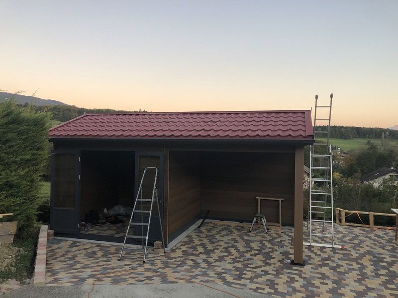 Das Haus ist in der Tat ein kompletter Bausatz aus PVC/Holz-Agglomerat (Baukoerper, Fenster/Tuer, Dach, Rinnen, Alu-Dacheindeckung samt Ortgang und First - aber man muss speziell fuer Dach und Rinnen sehr viel individuell anpassen ... LEGO ist das nicht) - kein Streichen, kein Gammel, kein Schimmel, kein nix. Und insgesamt <20qm, damit vereinfachtes Genehmigungsverfahren, was wichtig ist, weil wir in einem Naturschutzgebiet wohnen, in dem die Regeln fuer echte Baugenehmigungen deutlich strenger sind.